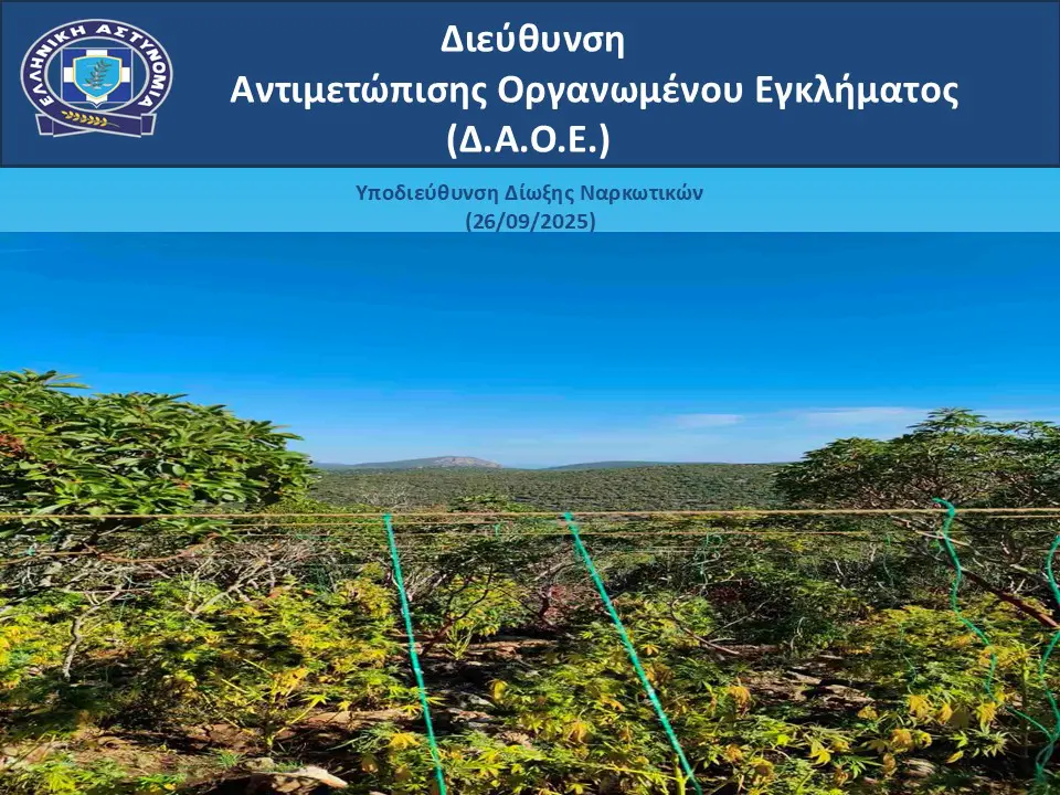 Η Διεύθυνση Αντιμετώπισης Οργανωμένου Εγκλήματος (Δ.Α.Ο.Ε.) της Ελληνικής Αστυνομίας, σε συνεργασία με το Τμήμα Δίωξης και Εξιχνίασης Εγκλημάτων Τρίπολης και με τη συνδρομή της Ε.Κ.Α.Μ. και ειδικά εκπαιδευμένου σκύλου ανίχνευσης ναρκωτικών, προχώρησε στην εξάρθρωση εγκληματικής οργάνωσης που δραστηριοποιούνταν συστηματικά στην καλλιέργεια και διακίνηση ακατέργαστης κάνναβης.