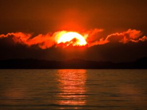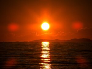 Ένα εντυπωσιακό ηλιοβασίλεμα αποτυπώθηκε στην παραλία Αλμυρού της Κέρκυρας, με τον ήλιο να βυθίζεται θεαματικά πίσω από το Διαπόντιο νησί Ερείκουσσα.