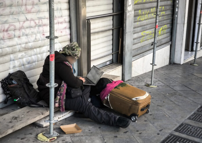 Η φωτογραφία που τράβηξε ο φωτορεπόρτερ Γιώργος Κονταρίνης (Eurokinissi) αποτυπώνει μια συγκινητική και δυνατή στιγμή: μια άστεγη γυναίκα στην Πλατεία Συντάγματος, καθισμένη στο πεζοδρόμιο, γράφει σε έναν φορητό υπολογιστή. Δίπλα της έχει τις αποσκευές της – μια βαλίτσα και ένα σακίδιο – δείγμα του ότι πιθανότατα ζει στον δρόμο. Παρόλες τις δυσκολίες, δείχνει προσήλωση και επιμονή να διατηρήσει κάποια επαφή με τον κόσμο, ίσως να δημιουργεί, να επικοινωνεί ή να προσπαθεί να σταθεί ξανά στα πόδια της.