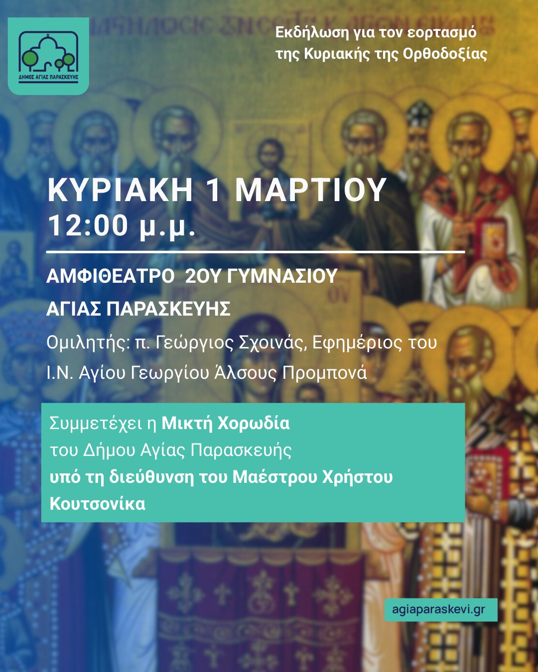 Κυριακή της Ορθοδοξίας: Εκδήλωση του Δήμος Αγίας Παρασκευής την 1η Μαρτίου 2026