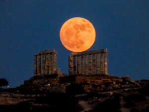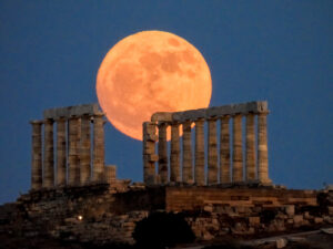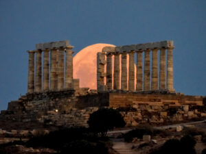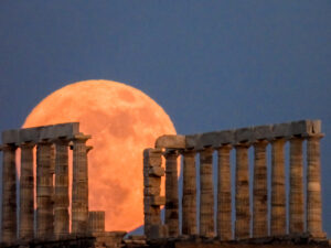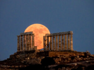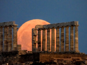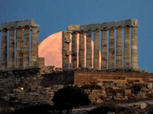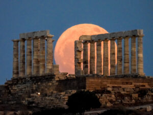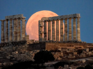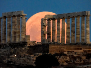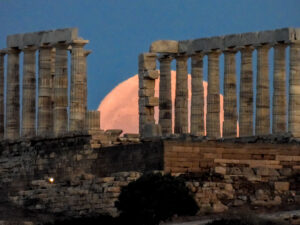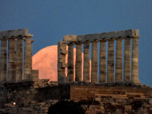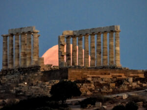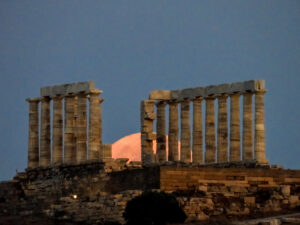 Οι εικόνες μιλούν από μόνες τους. Ο φακός του έμπειρου φωτορεπόρτερ Γιώργου Κονταρίνη, για λογαριασμό του πρακτορείου Eurokinissi, κατέγραψε μοναδικές φωτογραφίες του φεγγαριού καθώς ανατέλλει πίσω από τον Ναό του Ποσειδώνα στο Σούνιο, μόλις μία ημέρα πριν από την εντυπωσιακή πανσέληνο του Ιουνίου.