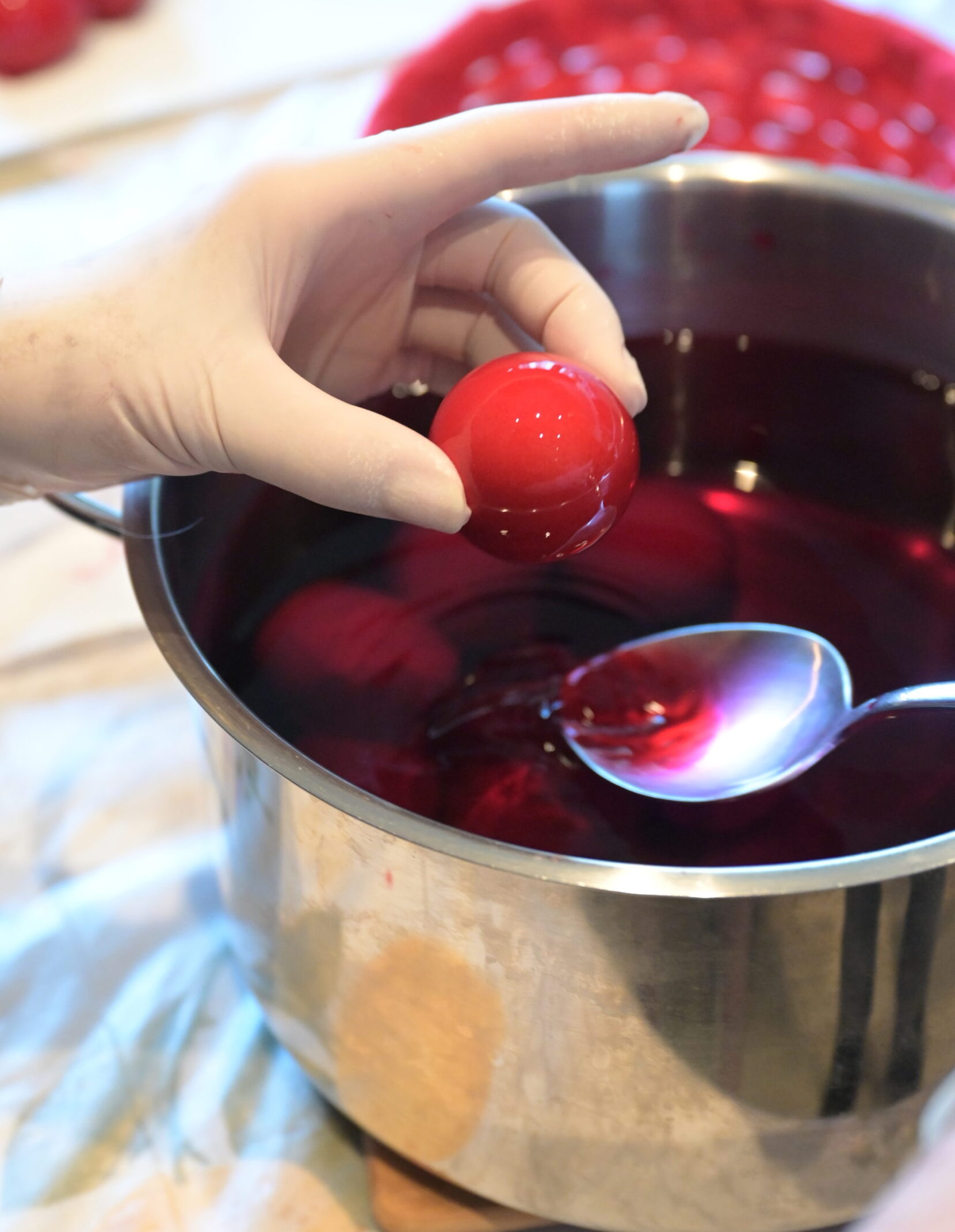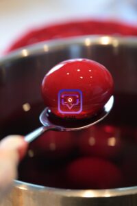 Στη συνέχεια, ετοίμασε τη βαφή σε ζεστό νερό, προσθέτοντας και εκεί λίγο ξύδι. Βάλε προσεκτικά τα αυγά μέσα στο διάλυμα και άφησέ τα για λίγα λεπτά, ανάλογα με το πόσο έντονο κόκκινο επιθυμείς. Η υπομονή σε αυτό το στάδιο κάνει τη διαφορά, καθώς το βαθύ και ομοιόμορφο χρώμα χρειάζεται τον χρόνο του.