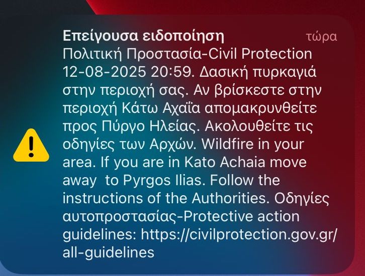 Το 112 εξέδωσε εντολή προληπτικής εκκένωσης για την Κάτω Αχαΐα, κωμόπολη 7.500 κατοίκων, με τους πολίτες να καλούνται να κατευθυνθούν προς τον Πύργο Ηλείας. Η απόφαση ελήφθη λόγω του επικίνδυνου πύρινου μετώπου και των ισχυρών ανέμων που δυσχεραίνουν τις επιχειρήσεις κατάσβεσης.
