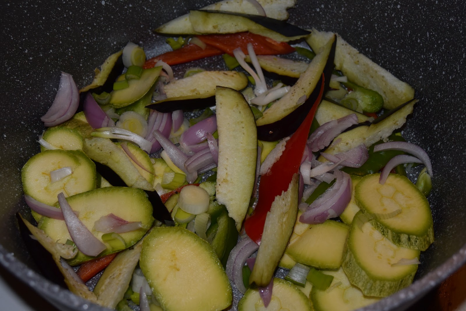 Βάζουμε όλα τα κομμένα λαχανικά σε αντικολλητικό τηγάνι ή κατσαρολίτσα.