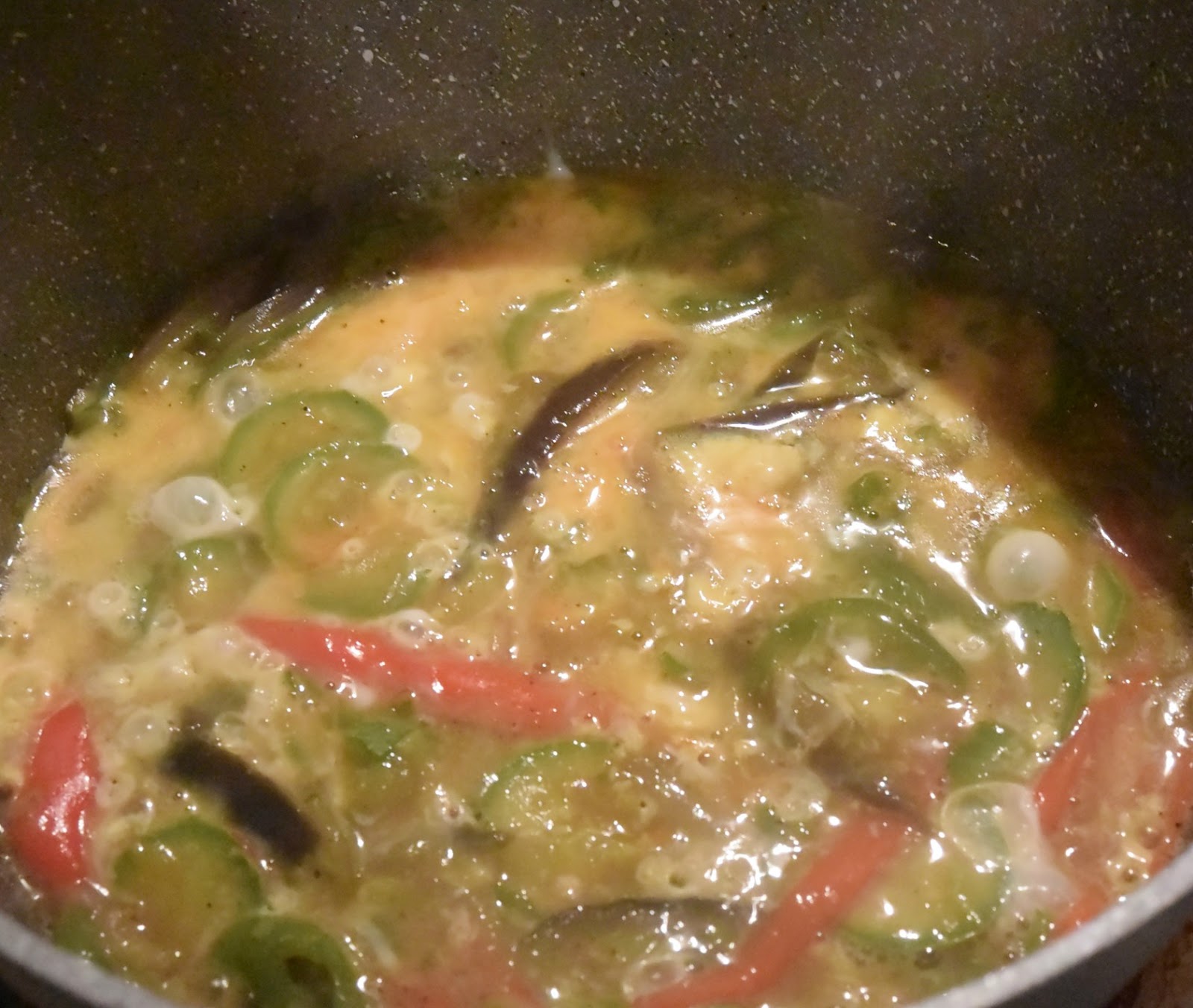 Μόλις τα λαχανικά μαλακώσουν — έχουμε συγχρόνως βάλει τα αυγά σε μπολ προσθέτουμε το γάλα το πιπέρι τον κουρκουμά και 2 κουταλιές σούπας νερό και τα χτυπάμε καλά .